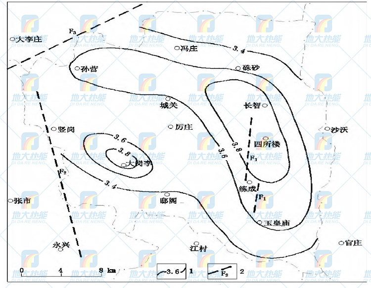 根據(jù)地溫梯度計(jì)算, 500 m埋深地溫變化范圍32~35℃, 1000 m埋深地溫變化范圍48~54℃。500 m埋深大于34℃的高溫區(qū)及1000 m埋深大于52℃的高溫區(qū)主要分布在長智-四所樓-練成-玉皇廟及大崗李一帶。地溫垂向上隨地層深度增加而增大, 300~500m深度為25~35℃;500~700 m深度為31~40℃;700~1000 m深度為40~53℃;推算1400 m深度地溫達(dá)60℃左右。