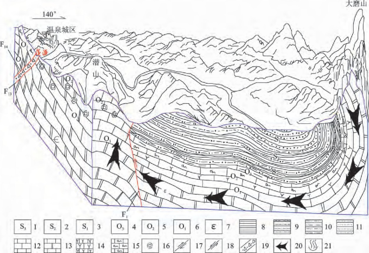 咸寧地質(zhì)構(gòu)造位置處于揚(yáng)子準(zhǔn)地臺梁子湖坳陷與咸寧臺褶束的交接部位,從屬于大幕山復(fù)式背斜北翼的次級構(gòu)造—高橋向斜、孫鑒鋪倒轉(zhuǎn)背斜、賈家山倒轉(zhuǎn)向斜的西延部分,由一系列的緊密褶皺組成區(qū)內(nèi)的基本構(gòu)造骨架。新華夏晚期構(gòu)造體系在潛山一帶表現(xiàn)強(qiáng)烈,其中大義山式斷裂有明顯的反映。這些不同的構(gòu)造體系互相干擾、復(fù)合,不僅控制了區(qū)內(nèi)的巖性組合、地貌、巖溶發(fā)育,而且也嚴(yán)格控制了地下水的分布及其補(bǔ)給、運(yùn)移和排泄。潛山背斜是地?zé)崽?/a>的主要構(gòu)造骨架,其特點是呈梳狀,且向南東倒轉(zhuǎn),區(qū)內(nèi)溫泉斷裂規(guī)模最大,且是經(jīng)過多次構(gòu)造變動的復(fù)合性斷裂,先期為縱張斷裂且以垂直運(yùn)動為主,后期表現(xiàn)為逆向復(fù)合,并受逆時針的應(yīng)力作用而顯壓扭性特征,是深切割斷裂,也是控制區(qū)內(nèi)地?zé)崃黧w分布的主要斷裂。
