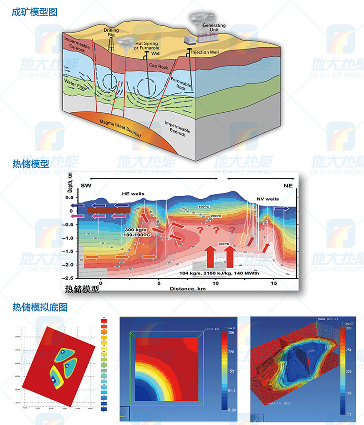 ⑤根據地質、地球物理、地球化學、錄井、試井等資料,建立熱儲模型,預測熱儲開采動態及開發時期可能獲得的產量,熱田地質環境變化,最終建立地熱田開發利用的優化管理模型。