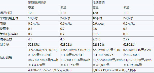 一直以來地源熱泵被認為是綠色的空調,但是在面對地源熱泵昂貴的安裝費用時,很多用戶都不知所錯,擔心地源熱泵并不是真正的節能,不能收回自己的初投資。那么,地源熱泵節能嗎,它與傳統的空調相比能為我們節省多少,我們來看看分析吧。 地源熱泵技術主要是利用地表的地熱資源,通過深埋于建筑物周圍的管路系統或地下水與建物內部完成熱交換的裝置。地表層的溫度一年四季都比較穩定,土壤溫度在20度左右,冬季比環境溫度高,夏天比環境溫度低,是很好的空調冷熱源。 由于地表層的這種特性,從而保證了家庭地源熱泵的高效性和經濟性。在制熱制冷時,家庭地源熱泵能夠將土壤的溫度搬到室內,其能量70%來自土壤,能效比高達4.2—5.3,輸入1KW的電量可以得到5KW以上的制冷制熱量。接下來就來為大家介紹下家庭地源熱泵與傳統空調的費用比較: