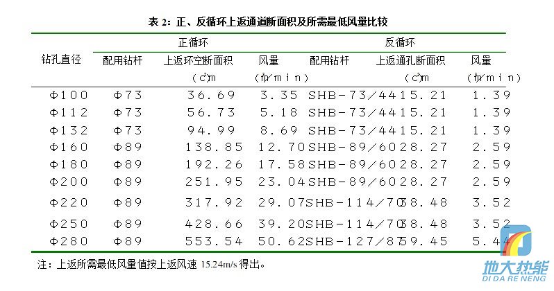 (1) 潛孔錘及雙壁鉆桿的中空斷面作為反循環通道,因斷面積小且直徑不變,在有限空 壓機供風量條件下,可增大上返風速,提高排渣能力,避免孔底重復破碎,從而提高鉆進效率及增大孔深和孔徑;同時也不用經常提拉鉆具吹孔,保持了鉆進的連續性;