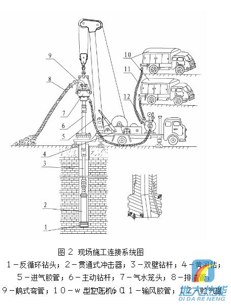 (3) 貫通式潛孔錘反循環鉆進,反循環排屑管可放在隨意位置,避免了干孔段粉塵揚及 水下鉆進井噴的污染,改善了孔口工人的工作條件;