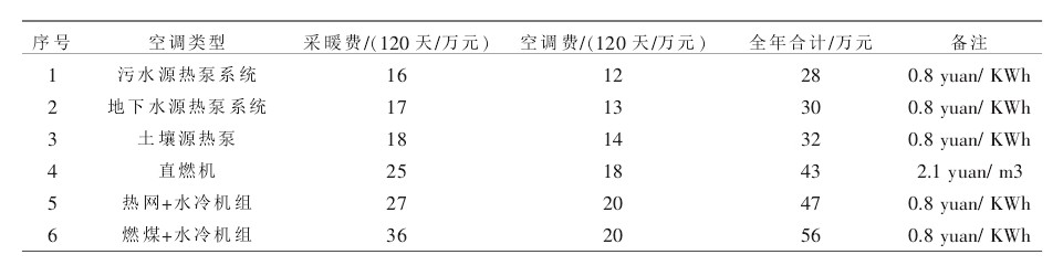 從上述表格可以明顯地看出來,污水源熱泵系統(tǒng)有良好的經(jīng)濟(jì)效益,與地下水源熱泵、直燃機(jī)、熱網(wǎng)+水冷機(jī)組、燃煤+水冷機(jī)組等系統(tǒng)相比,該系統(tǒng)經(jīng)濟(jì)優(yōu)勢十分明顯。