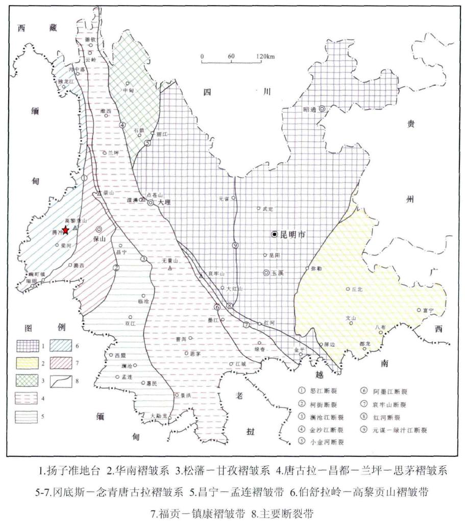 圖1 云南騰沖縣地理位置圖 2.項(xiàng)目區(qū)地質(zhì)背景 騰沖縣位于高黎貢山西側(cè),總體地勢(shì)北高南低,山脈走向?yàn)楸睎|一西向及南北向,與區(qū)域構(gòu)造線基本一致。高黎貢山與怒江并列向南蜿誕,高黎貢山峰脊一線海拔多在3000m以上;而怒江河谷海拔僅500—900m,區(qū)內(nèi)最高峰為高黎貢山中段的大腦子,海拔3780.9m;最低點(diǎn)為盈江縣拉沙河與穆雷江交匯處,海拔僅210m;最大高差達(dá)3570.9m,一般高差在400—2000m之間,屬中高山中一深切割地區(qū)。縣城西側(cè)為高中山地貌景觀,谷深坡陸;東側(cè)為中山山地稍為平緩,但切割密度較大;中部為斷陷谷地,河流階地發(fā)育,地勢(shì)平坦開闊。騰沖地區(qū)構(gòu)造運(yùn)動(dòng)活躍、斷裂構(gòu)造發(fā)育、巖漿活動(dòng)頻繁、火成巖分布廣泛、新生代火山活動(dòng)、現(xiàn)代水熱活動(dòng)異常強(qiáng)烈,溫沸泉眾多。