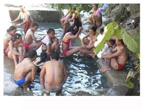 云南躍進(jìn)橋溫泉風(fēng)景澡堂會的熱水最高達(dá)70-80度,由于是自然溫泉,含有多種礦物質(zhì)和稀有金屬元素,對人體的某些疾患有特殊的療效,因而慕名前往洗浴的客人遠(yuǎn)到西藏也不乏大有人在,只是現(xiàn)在的時間主要是周邊的人們,到三、四月份就會有更多遠(yuǎn)方的西域者陸續(xù)到來。不少洗浴者一洗就是十天半月,更有甚者能洗兩到三個月,目的是治病,據(jù)說還真有不少人治好了疑難雜癥,不然的話怒江“澡堂會”怎么會在印度、尼泊爾、巴基斯坦、新加坡、馬來西亞甚至美國等地聞名遐邇。